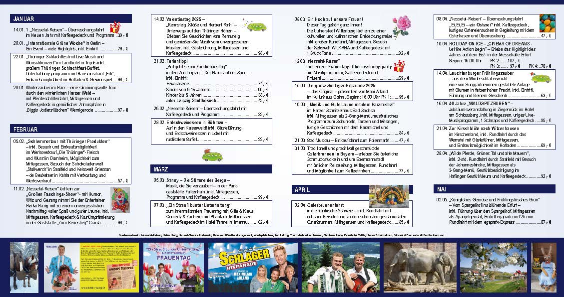 Tagesfahrten sind beliebte, kleine Reisen – ideal um etwas Neues zu entdecken und einen Tag „rauszukommen“. Mit dem Bus ist das umso bequemer und geselliger. Stöbern Sie im umfangreichen Angebot an Tagesfahrten und lassen Sie sich inspirieren. Passende Tagesfahrten finden Sie zu jeder Jahreszeit. Auch in puncto Reiseziel stehen Ihnen von kurzen Städtereisen bis hin zu wunderschönen Reisezielen in der Natur alle Möglichkeiten für ihren Kurzurlaub offen.